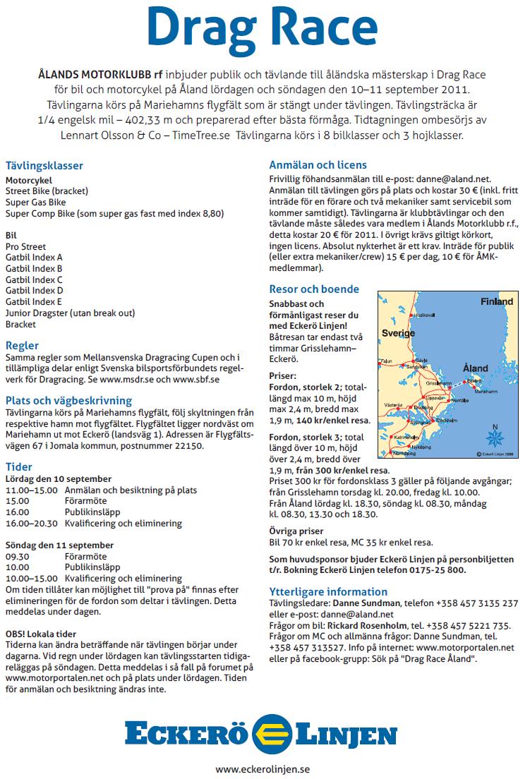 ÅLANDS MOTORKLUBB rf inbjuder publik och tävlande till åländska mästerskap i Drag Race för bil och motorcykel på Åland lördagen och söndagen den 10–11 september 2011.